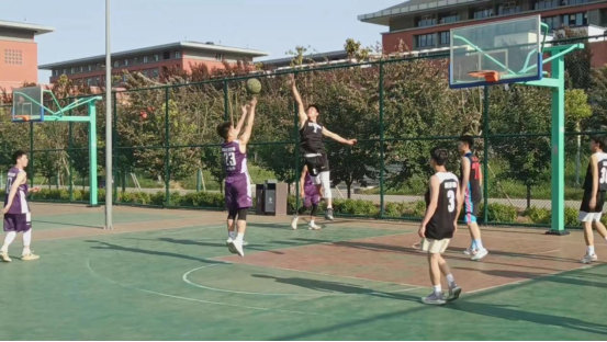 在烈日骄阳下,在学生的欢呼声中,运动员在球场上挥汗水,传球,抢球,突破,防守,进攻,投篮,配合默契。女子篮球赛,运动员奋力拼搏,投篮“快、准、狠”,尽显巾帼本色;男子篮球赛,他们严守应对,默契传球,配合完美。场上运动员热情似火,神采飞扬。场外观众热血沸腾,轰动全场。他们在肆意昂扬的青春里,用汗水书写团结与拼搏。