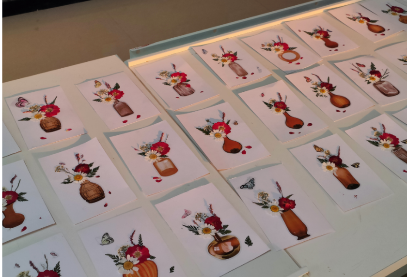压花制作环节,学生们学习如何将鲜花进行压制和保存。通过亲手制作,学生们体验到了压花艺术的魅力,也了解了植物在园林设计中的重要性。